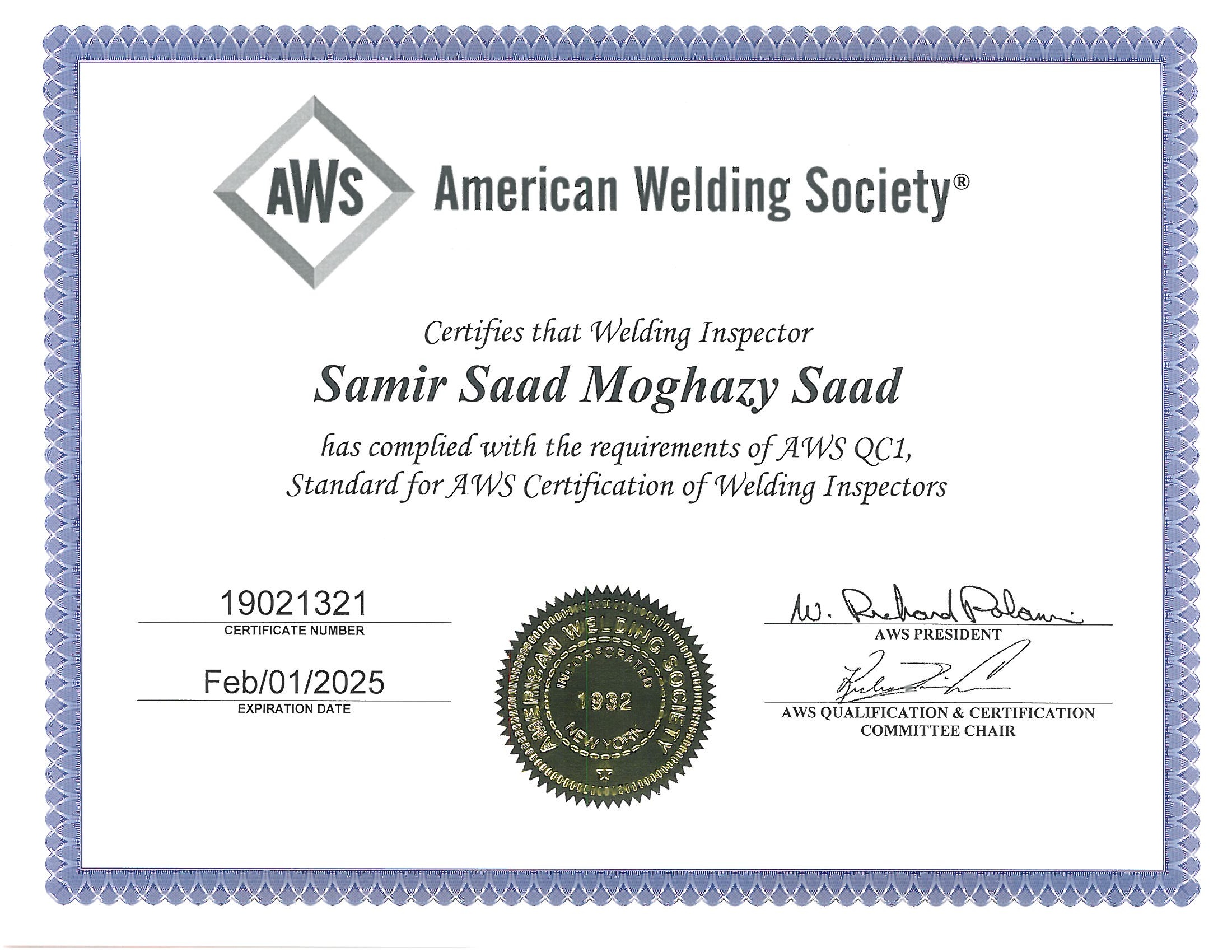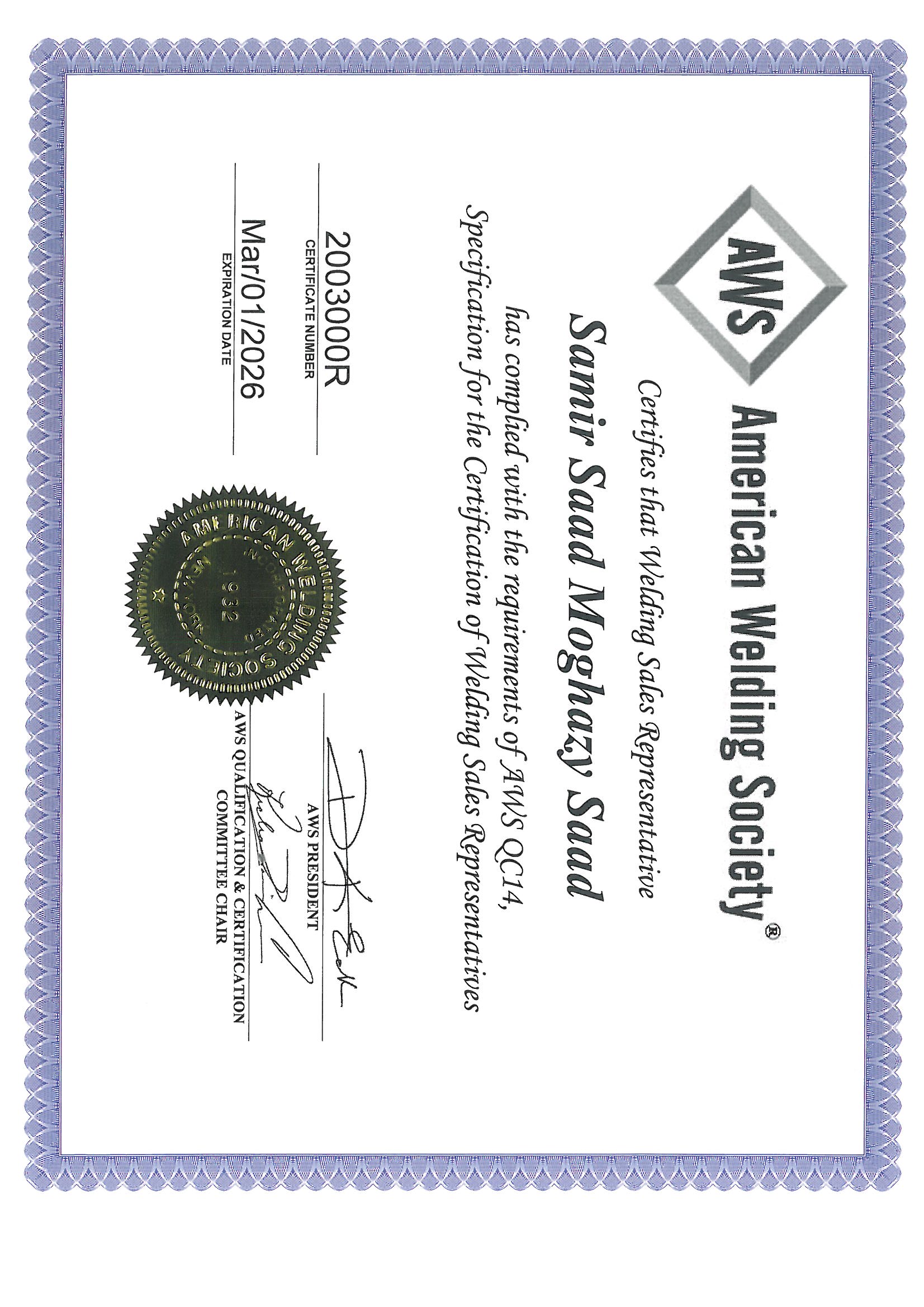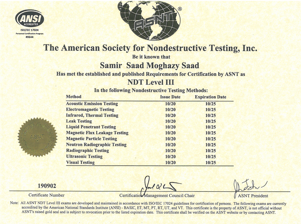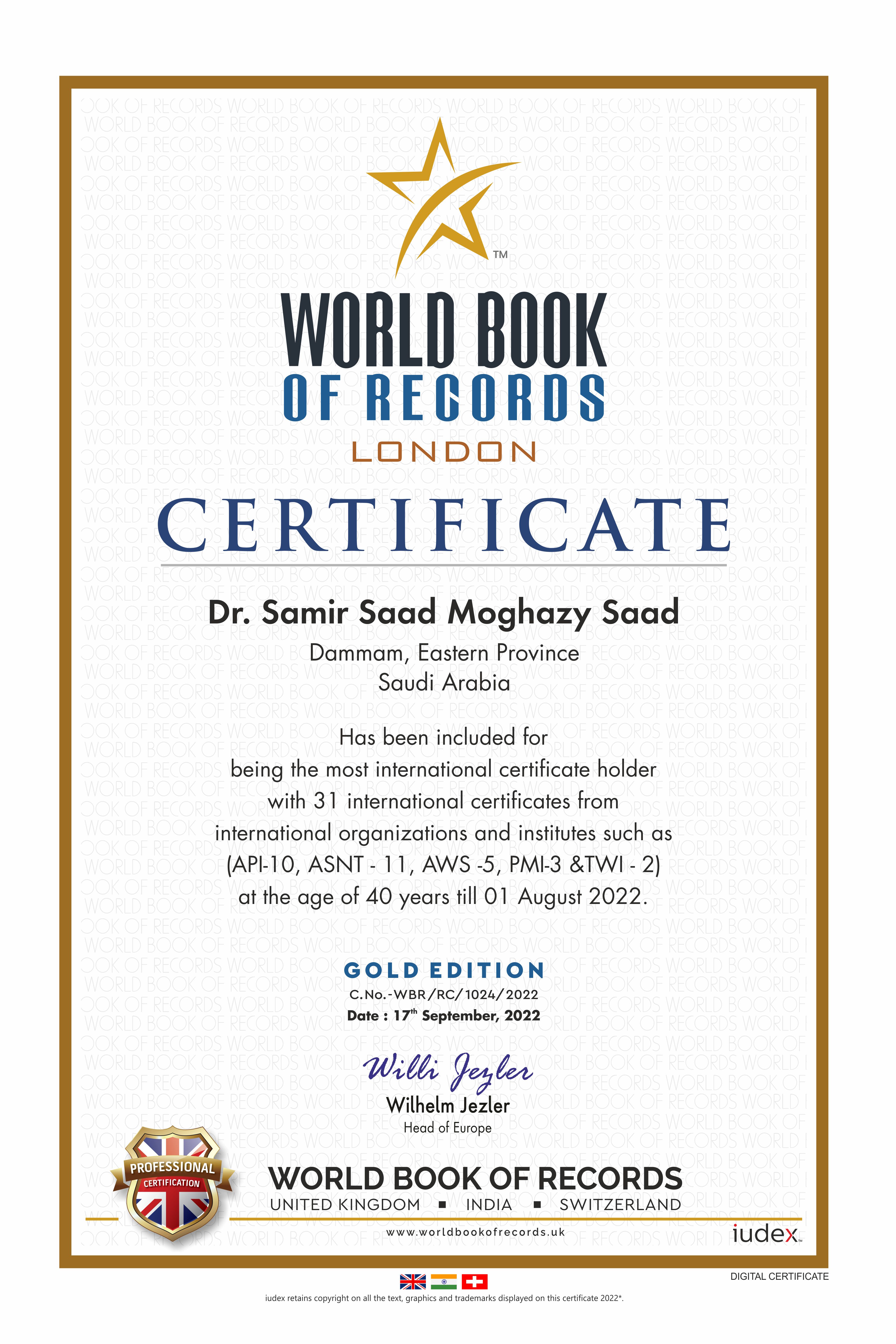 Recognized by the World Book of Records for holding the most international certificates (31) from organizations such as API, ASNT, AWS, PMI, and TWI at the age of 40