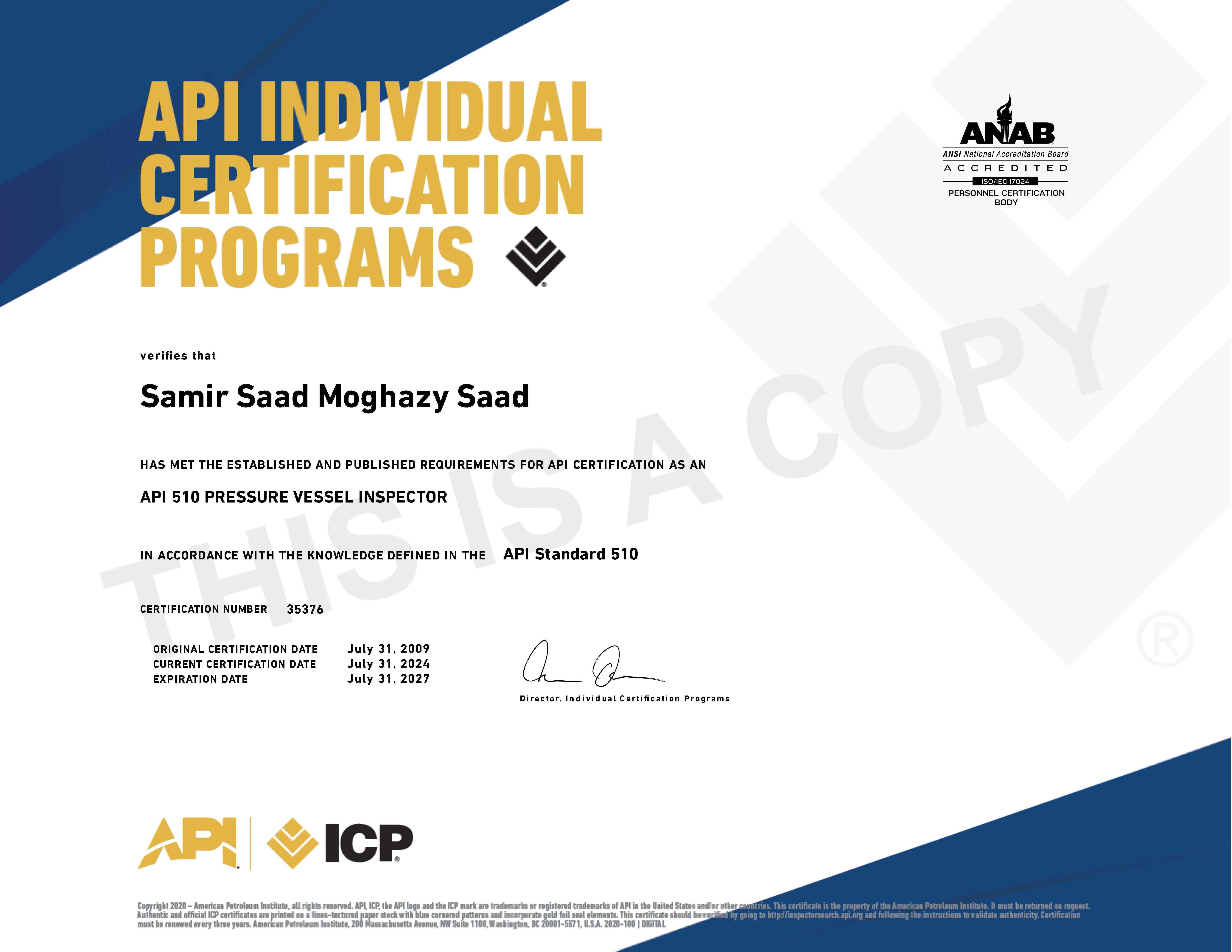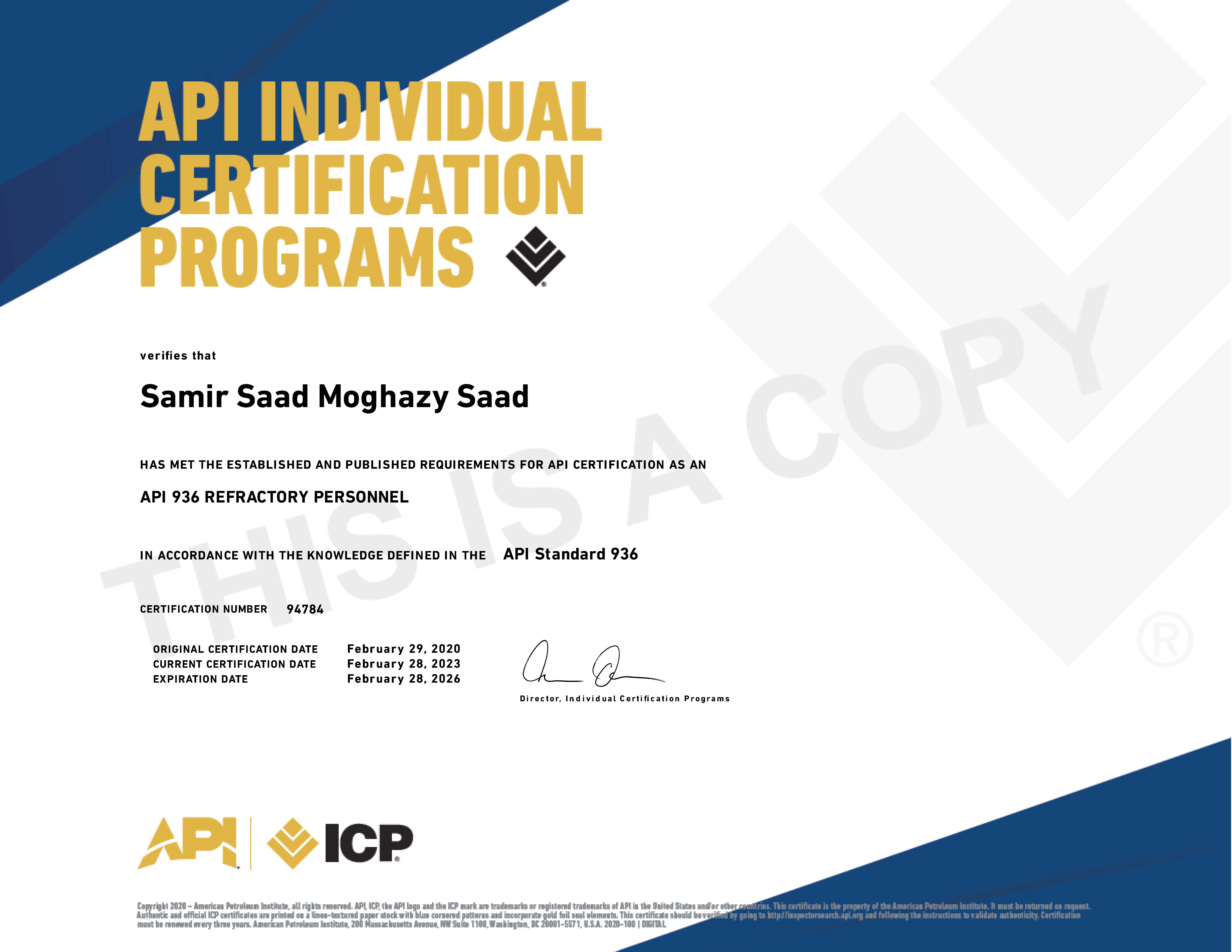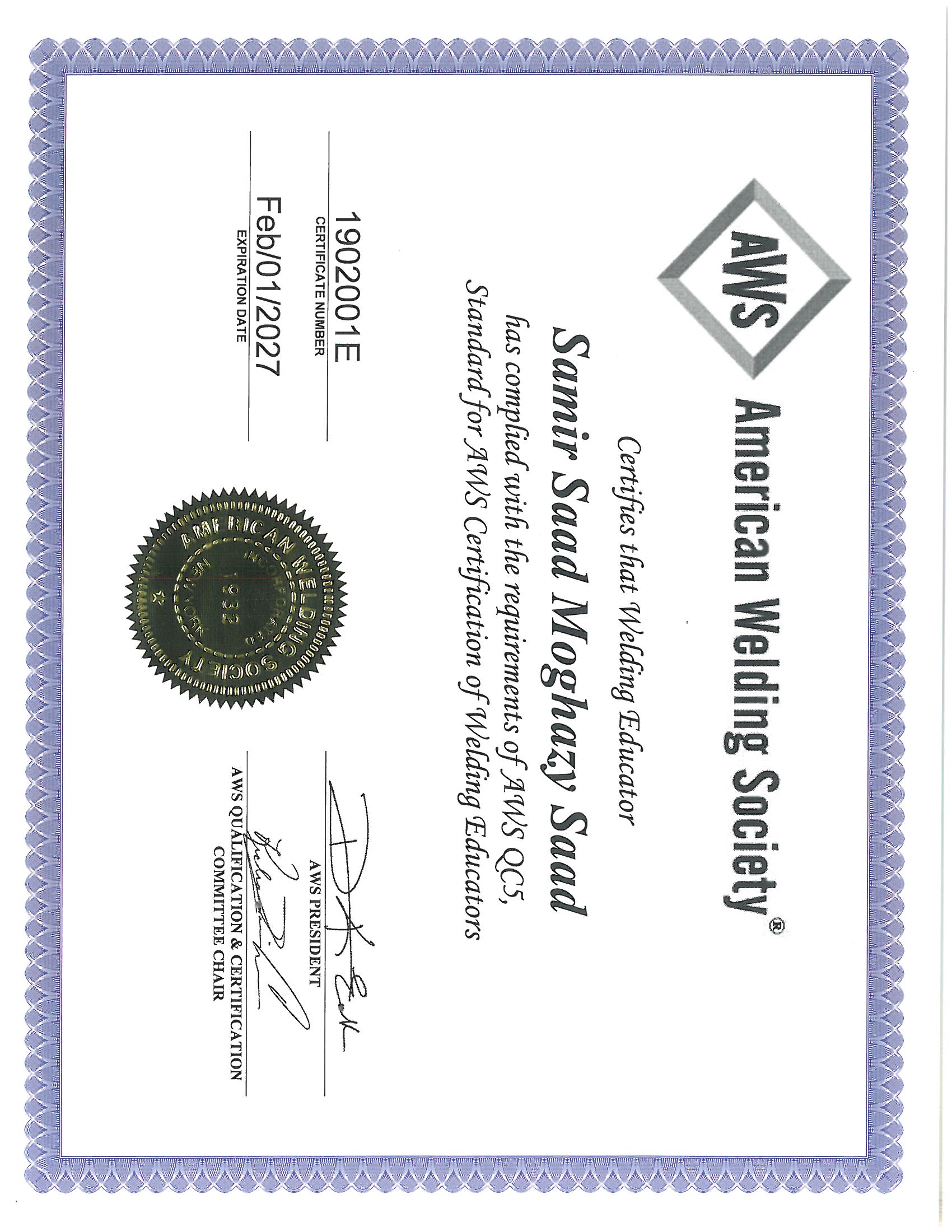 Recognized by the World Book of Records for holding the most international certificates (31) from organizations such as API, ASNT, AWS, PMI, and TWI at the age of 40